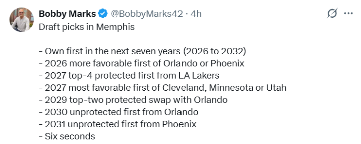 据美记BobbyMarks统计,灰熊目前在未来数年内握有大量选秀资产,具体如下: